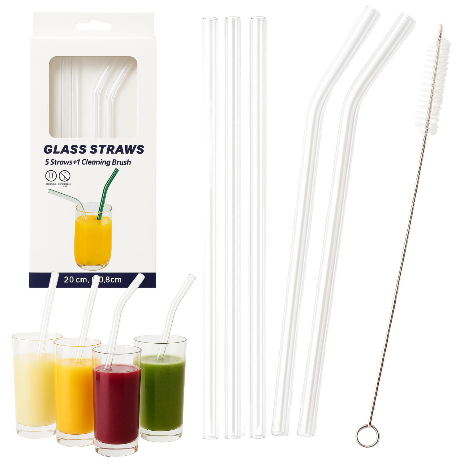 Ten uroczy zestaw zawiera 5 przezroczystych, szklanych słomek o długości 20 cm i średnicy 0,8 cm – idealnych do smoothie, soków, lemoniady i kawy mrożonej.